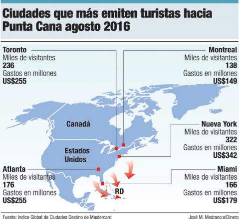 El estudio revela que, aunque se trata de la tercera ciudad latinoamericana en cantidad de visitantes (2.7 millones), Punta Cana ocupa el primer puesto en gasto, con US$2,900 millones entre agosto de 2015 y agosto de 2016.